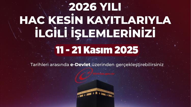 2026 yılı haccı için kesin kayıt hakkı elde eden hacı adaylarımızın kesin kayıt işlemlerini 11 - 21 Kasım 2025 tarihleri arasında mutlaka yapması gerekmektedir.